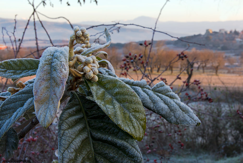 El Níspero del Japón (Eriobotrya japonica), es uno de los pocos arboles frutales que florece al principio del invierno. Es la primera vez que nuestro árbol florece, después de una existencia algo precaria de unos 5 años. El suelo calcáreo puede ser el problema.