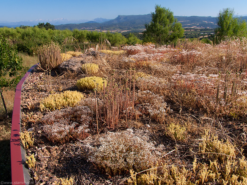 In the last 4 weeks only a few litres of rain have fallen and that`s too little for the grass species to survive in the 6cm of soil on the roof but enough for the Sedum species to flower and thrive. The yellow Sedum acre has finished flowering and it`s now the time for the white flowers of Sedum album and S.anglicum, soon to be followed by the yellow flowering Sedum reflexum and then the white flowers of S.sediforme. Most of the plants originate from the cuttings I planted three years ago. No irrigation or practically no maintenance whatsoever is required and the layer of soil and vegetation forms a nice protective and isolating layer for the roof. Recommended.