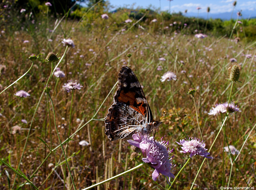 Scabiosa columbaria se beneficia claramente del regimen de siega, siendo (co-)dominante en una área considerable y floreciendo durante semanas sin parar. Parece frágil, alcanzando más de 1,5 metros en altura, pero es realmente bastante robusto e incluso puede soportar algo de pisoteo. Atrae un montón de insectos, sobre todo mariposas que no parecen tener problemas con el terrible balanceo en el viento, en este caso una Vanesa de los cardos (Vanessa cardui).