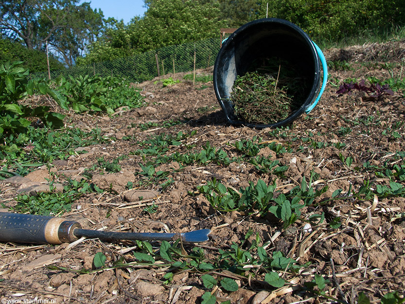 El año pasado no dediqué suficiente tiempo al desherbar el huerto y me fie demasiado de la gruesa capa de paja. Un fallo importante que es castigado severamente por Convolvulus arvensis (Correhuela), una planta tremendamente vital y vigoroso que no tiene ningún problema con una capa de 20cm de paja. Sale de la paja simplemente retorciéndose e incluso aprecia mucho la cantidad extra de material orgánica que la paja deja al suelo. Las partes encima del suelo no sobreviven el invierno pero las rizomas si lo hacen y también las semillas pueden sobrevivir más de 20 años.